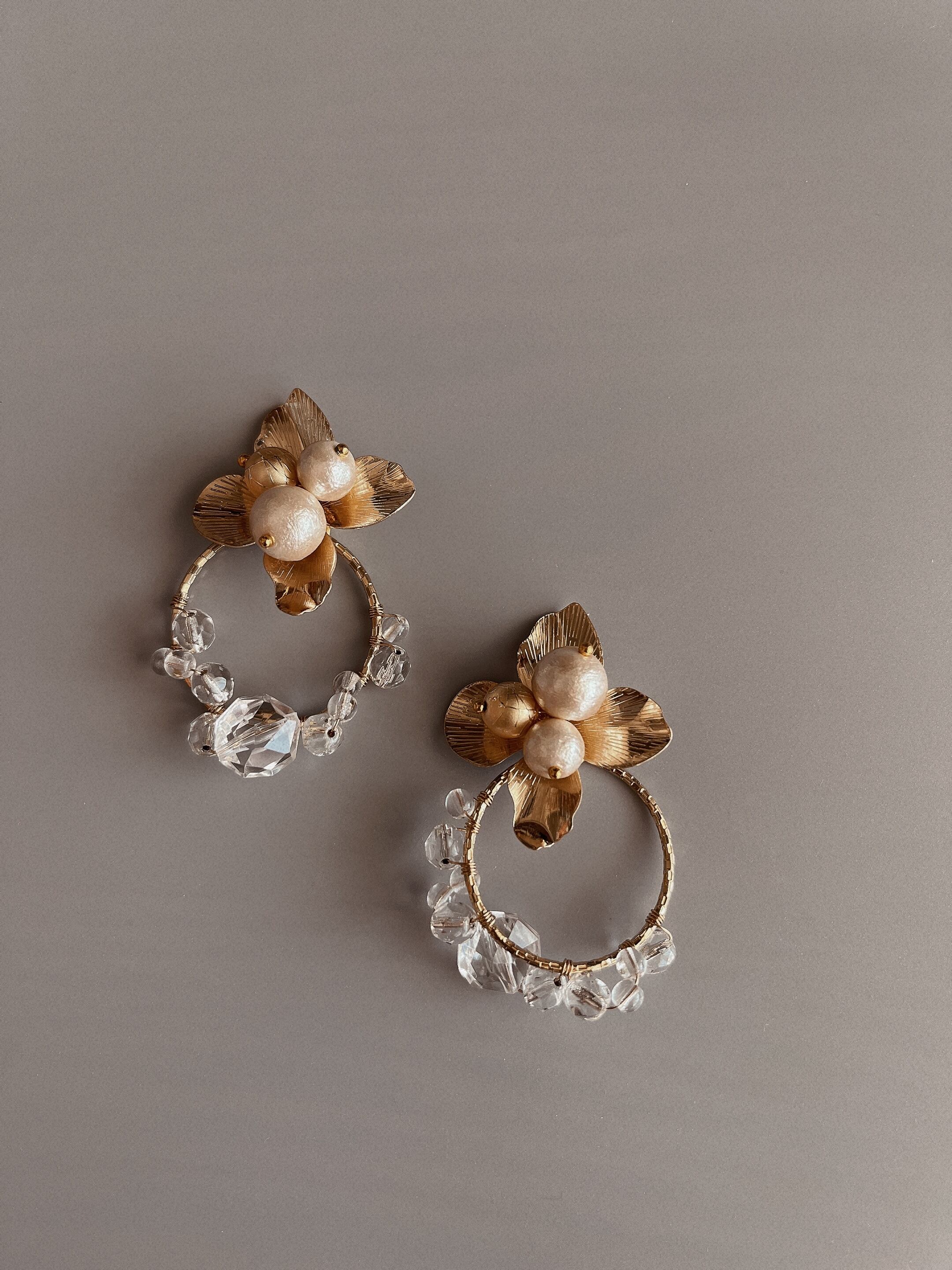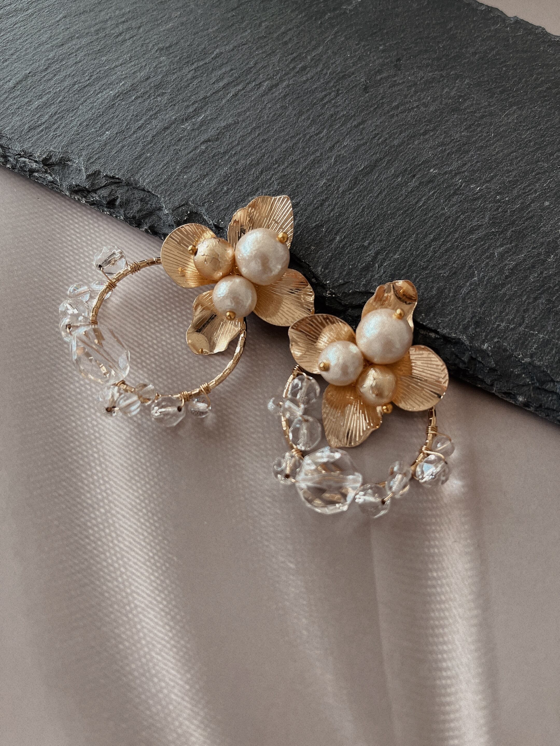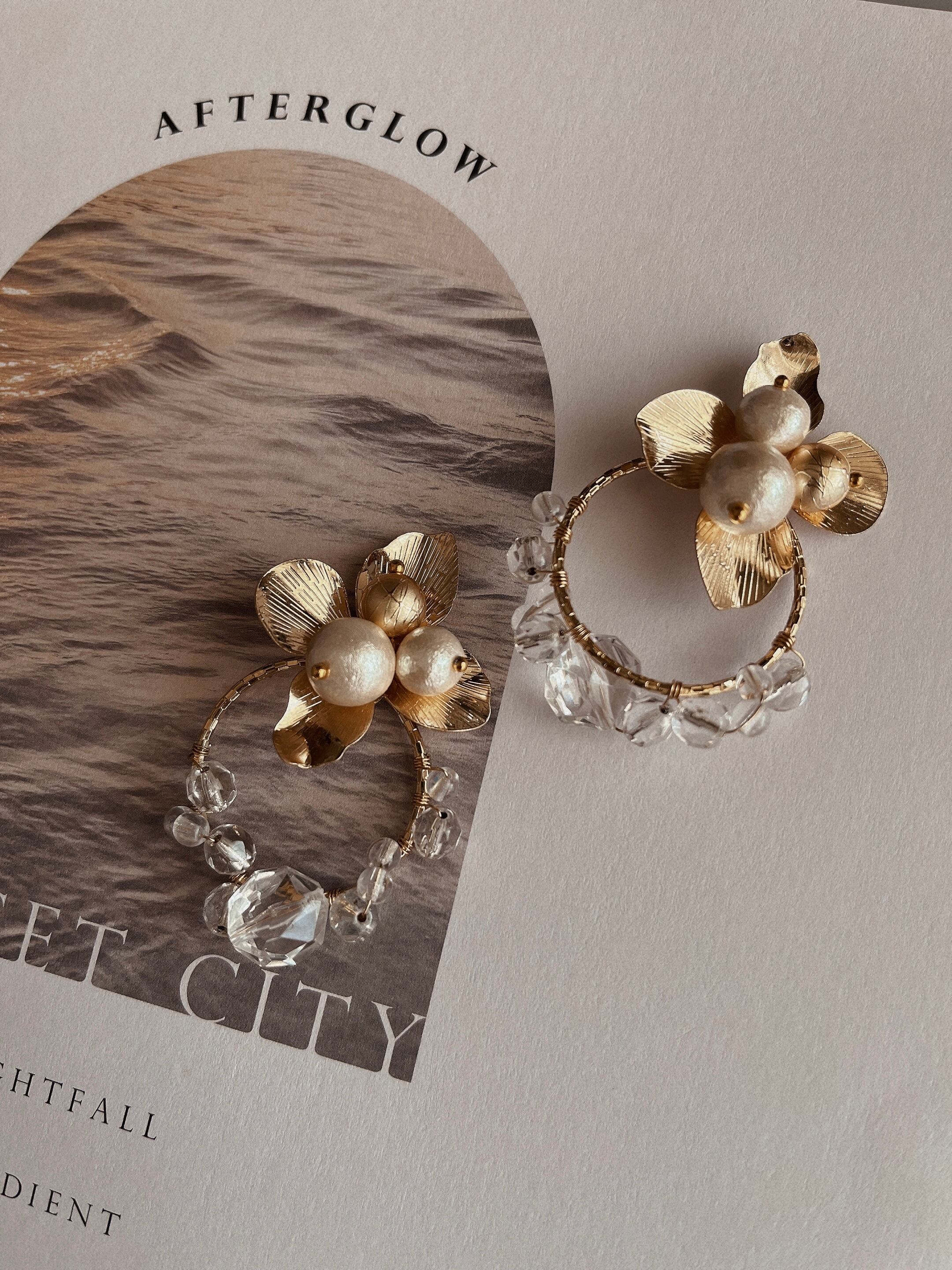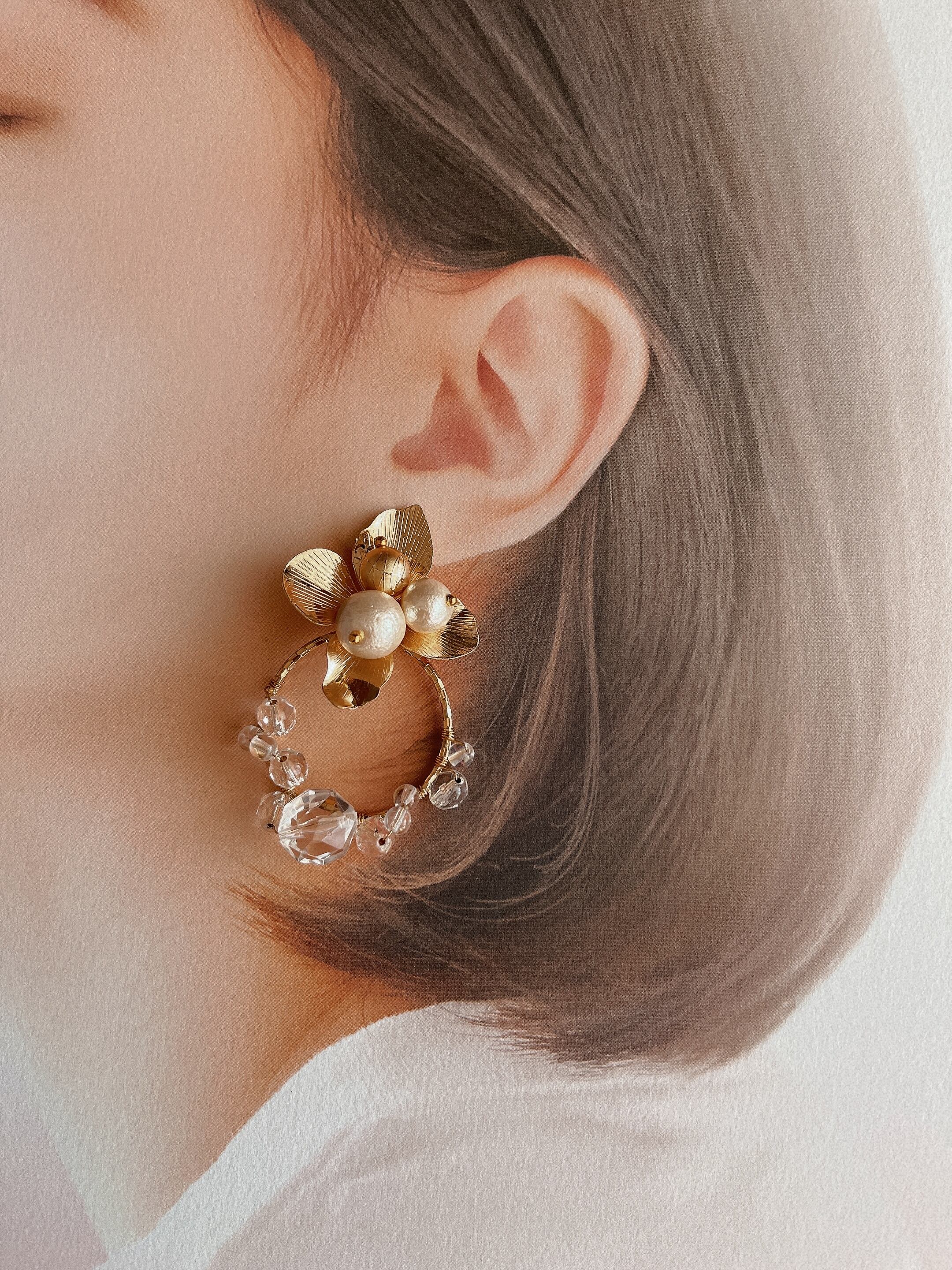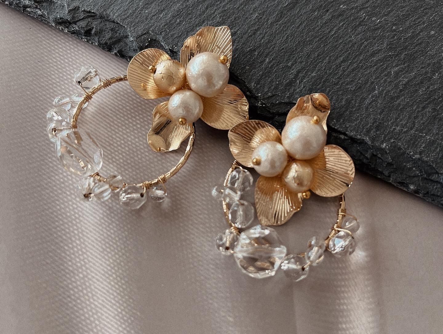 フラワーの中心部分はコットンパールとゴールドビーズを施し、まるでice dropのようなクリスタルビーズを合わせてデザインしました❁