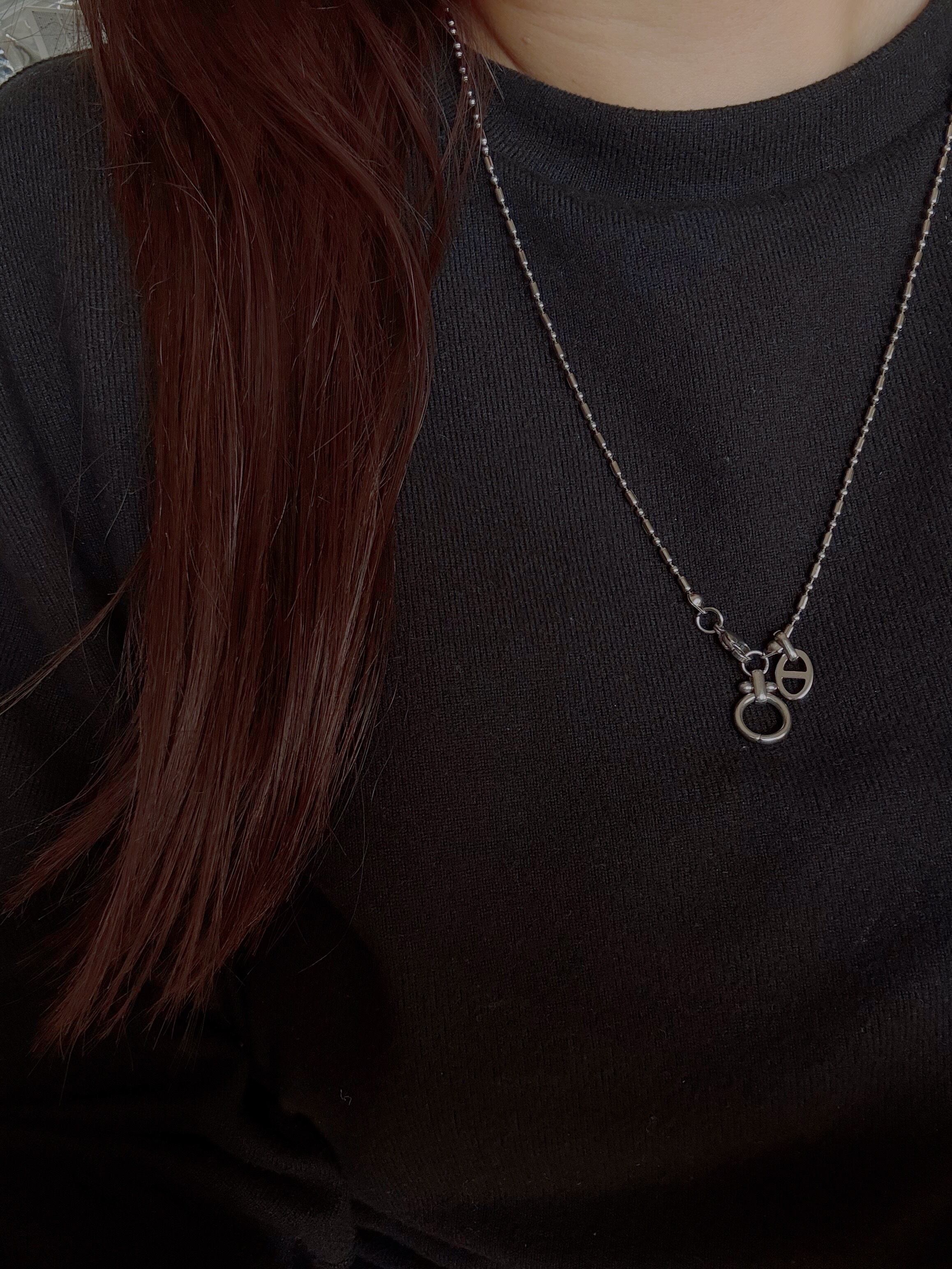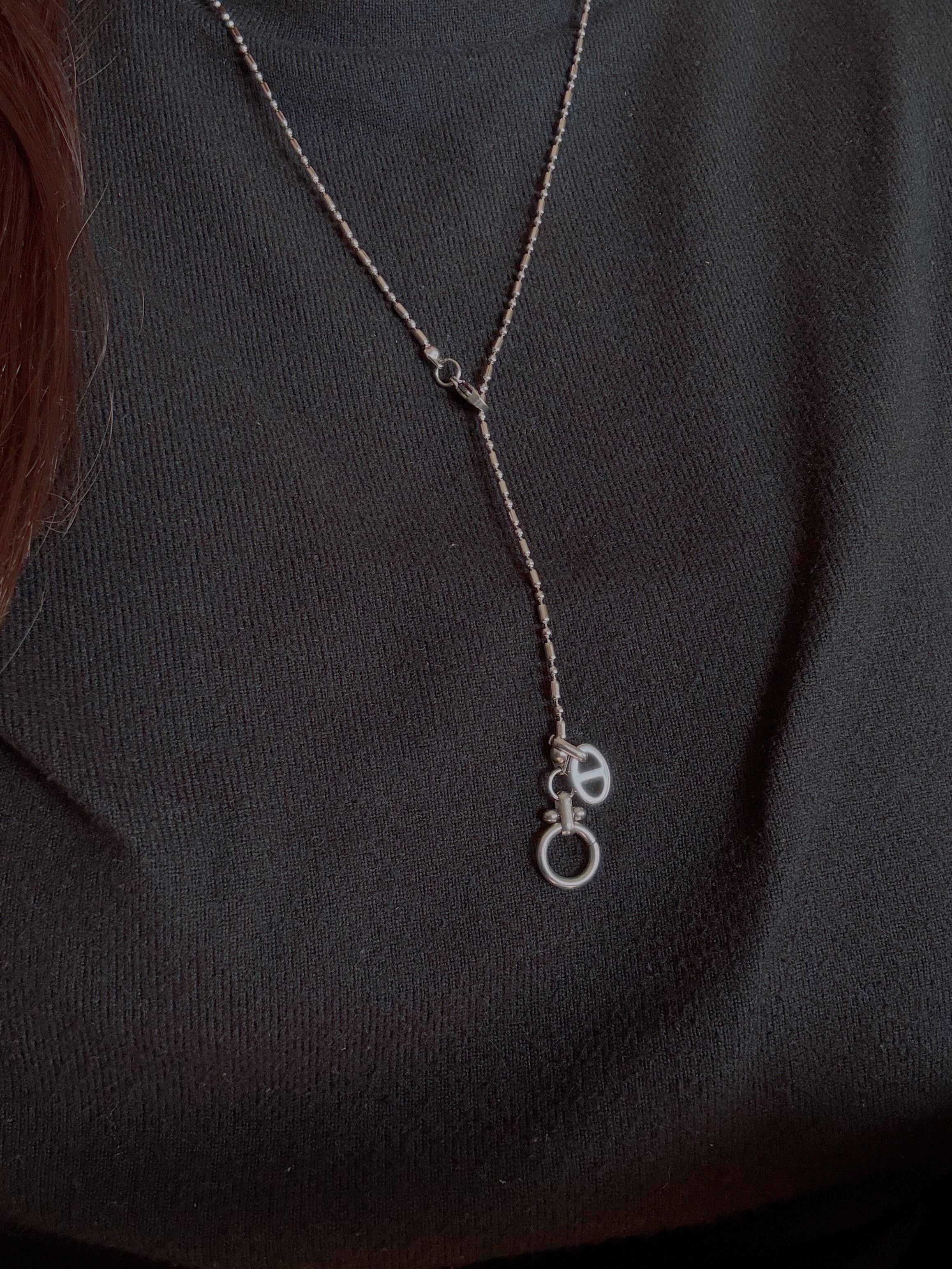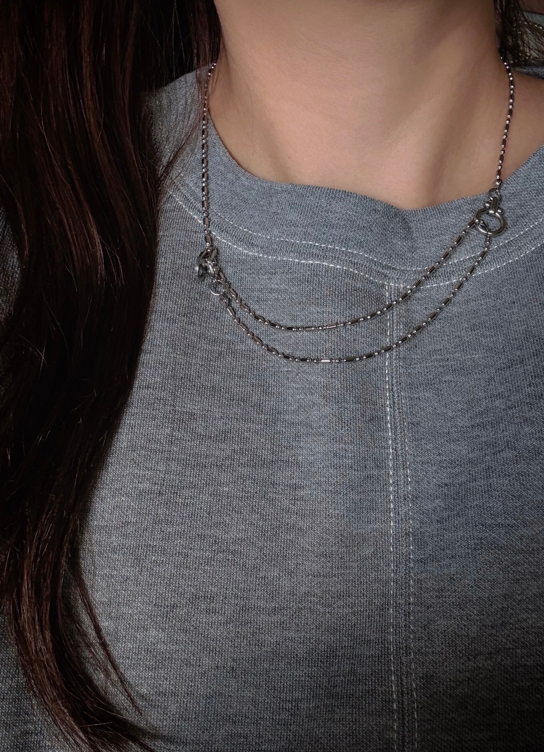 高品質なステンレス素材を使用したシルバーカラーのネックレスで、付け方次第で自由なアレンジが楽しめるアイテムです。