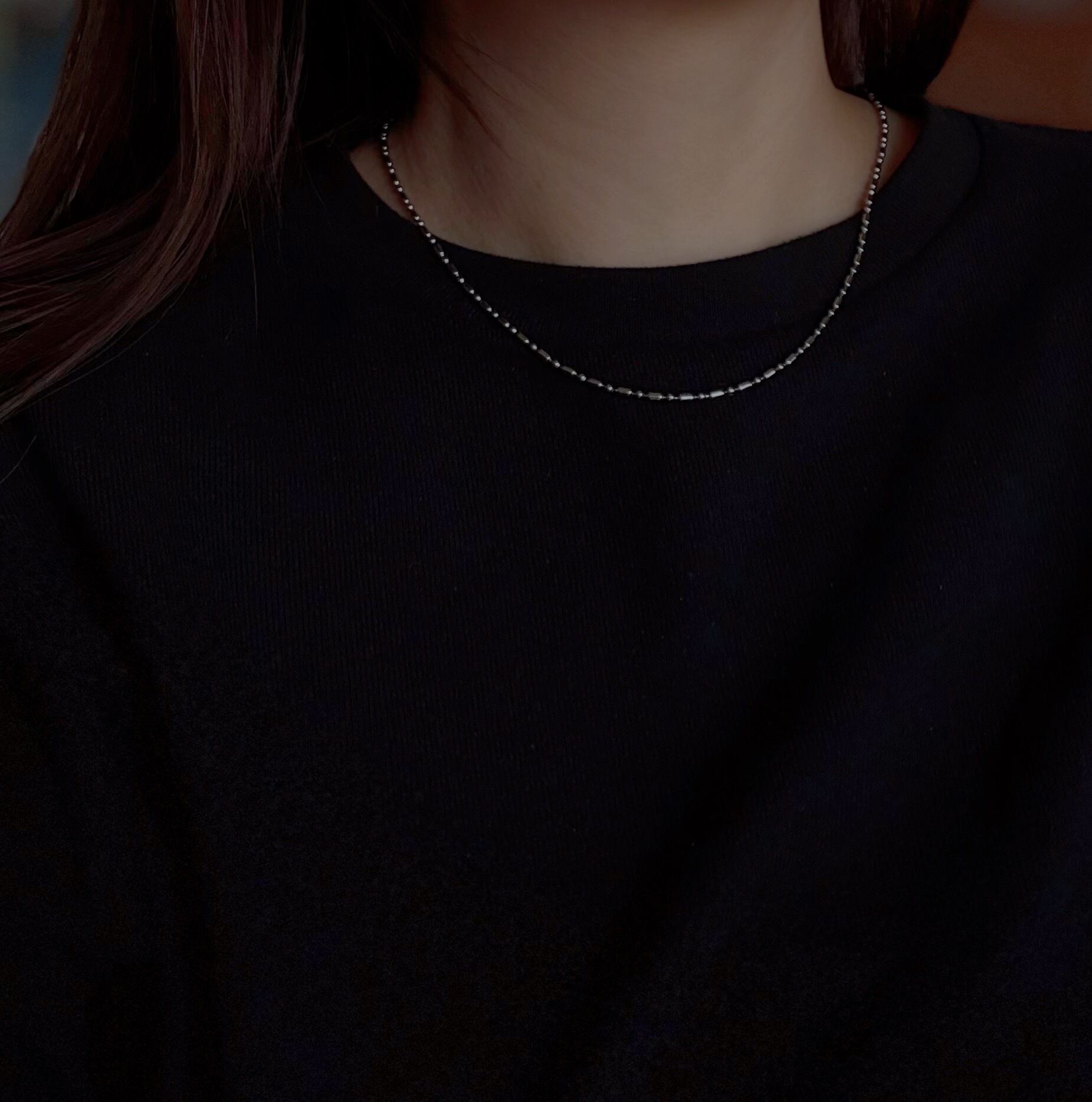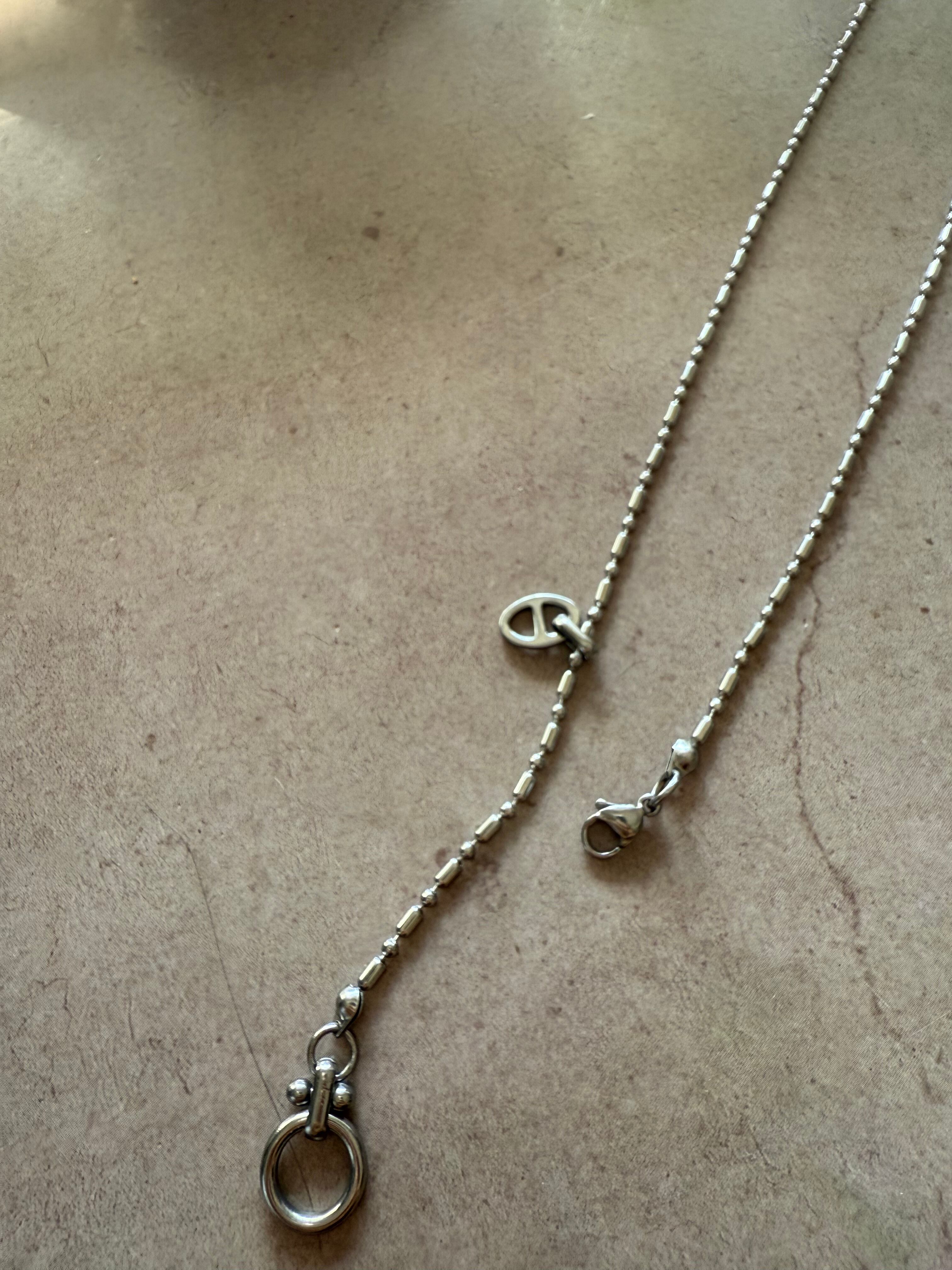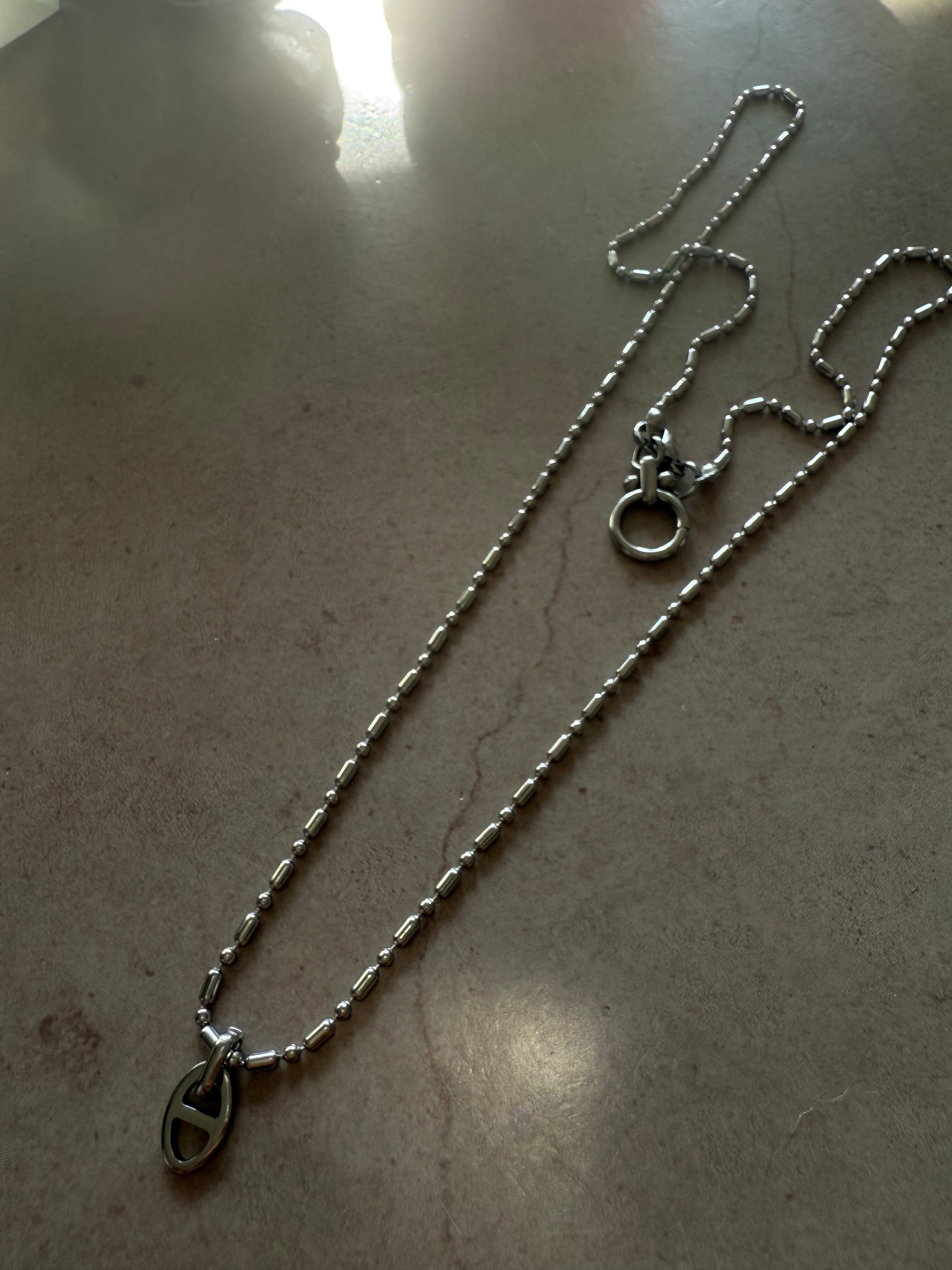 高品質なステンレス素材を使用したシルバーカラーのネックレスで、付け方次第で自由なアレンジが楽しめるアイテムです。